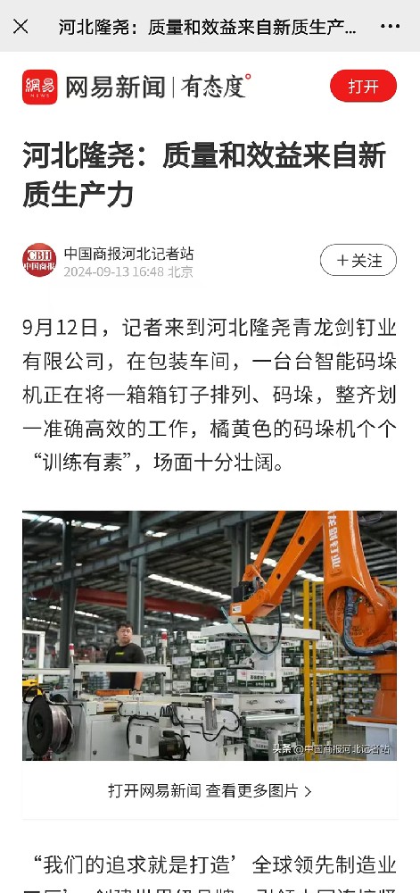 近日,中國(guó)新聞網(wǎng)記者走進(jìn)河北隆堯青龍劍釘業(yè)有限公司,對(duì)制釘車間的生產(chǎn)工序及車間環(huán)境進(jìn)行了解和拍攝。7月9日下午,青龍劍釘業(yè)榮登中國(guó)新聞網(wǎng)。青龍劍釘業(yè)將不斷探索、研發(fā)產(chǎn)品,通過(guò)技術(shù)升級(jí)、產(chǎn)品創(chuàng)新,為社會(huì)提供更高效、更安全緊固產(chǎn)品,提供更全面的基材連接緊固系統(tǒng)解決方案,樹立行業(yè)標(biāo)桿,助力國(guó)家建設(shè)![詳情] 2024-07-19 14:26:03